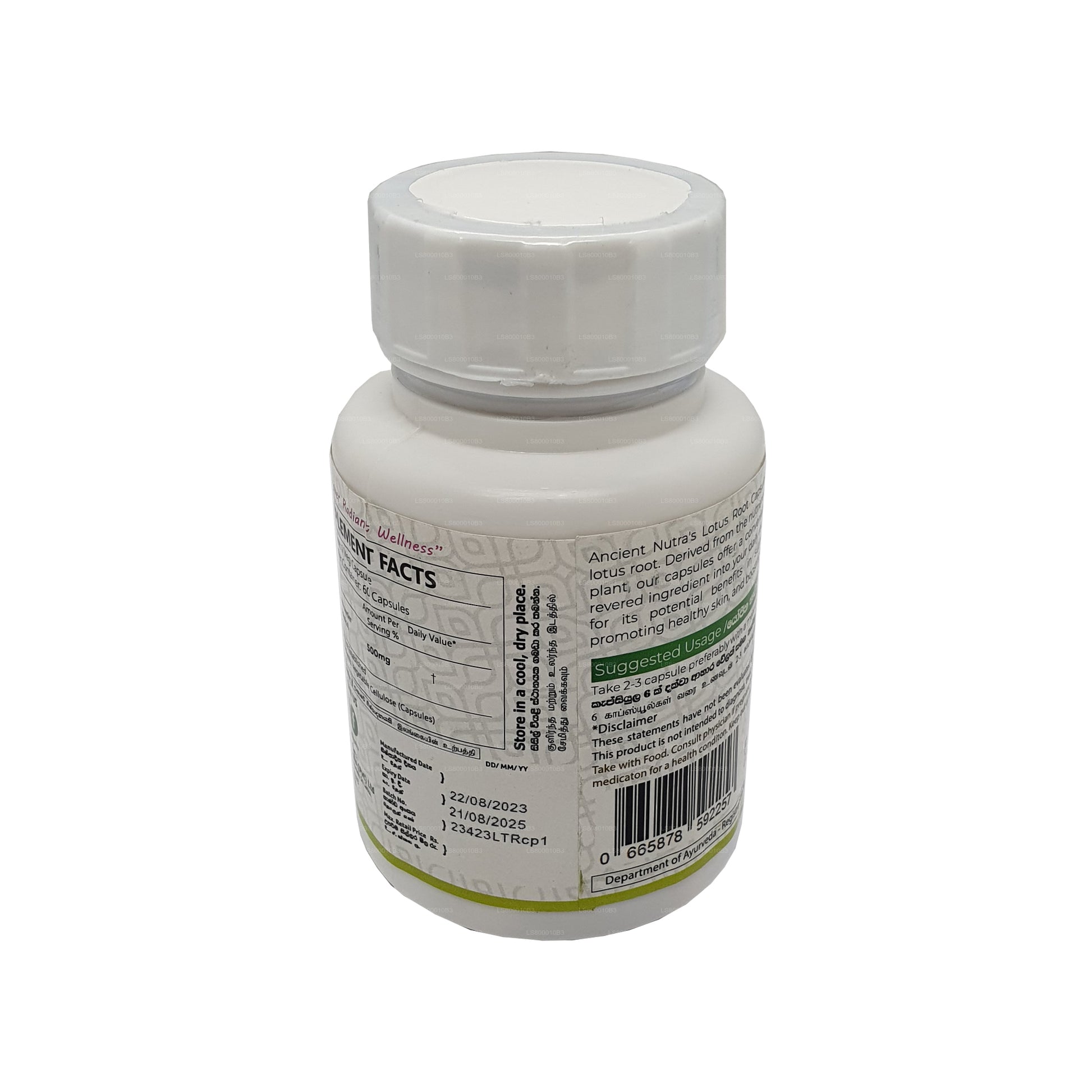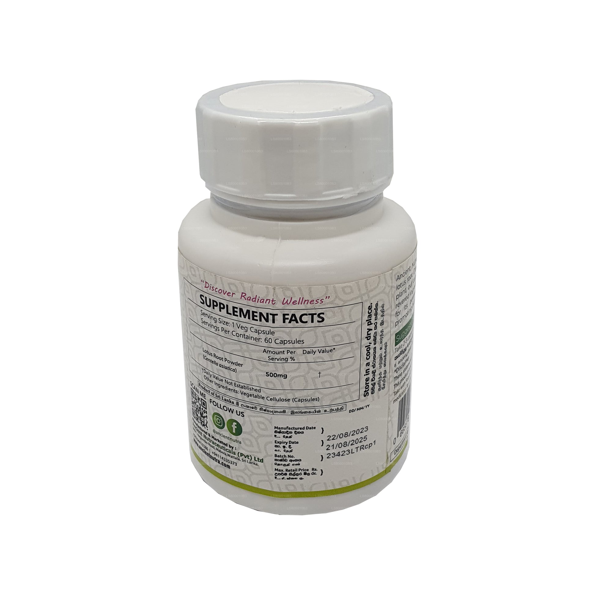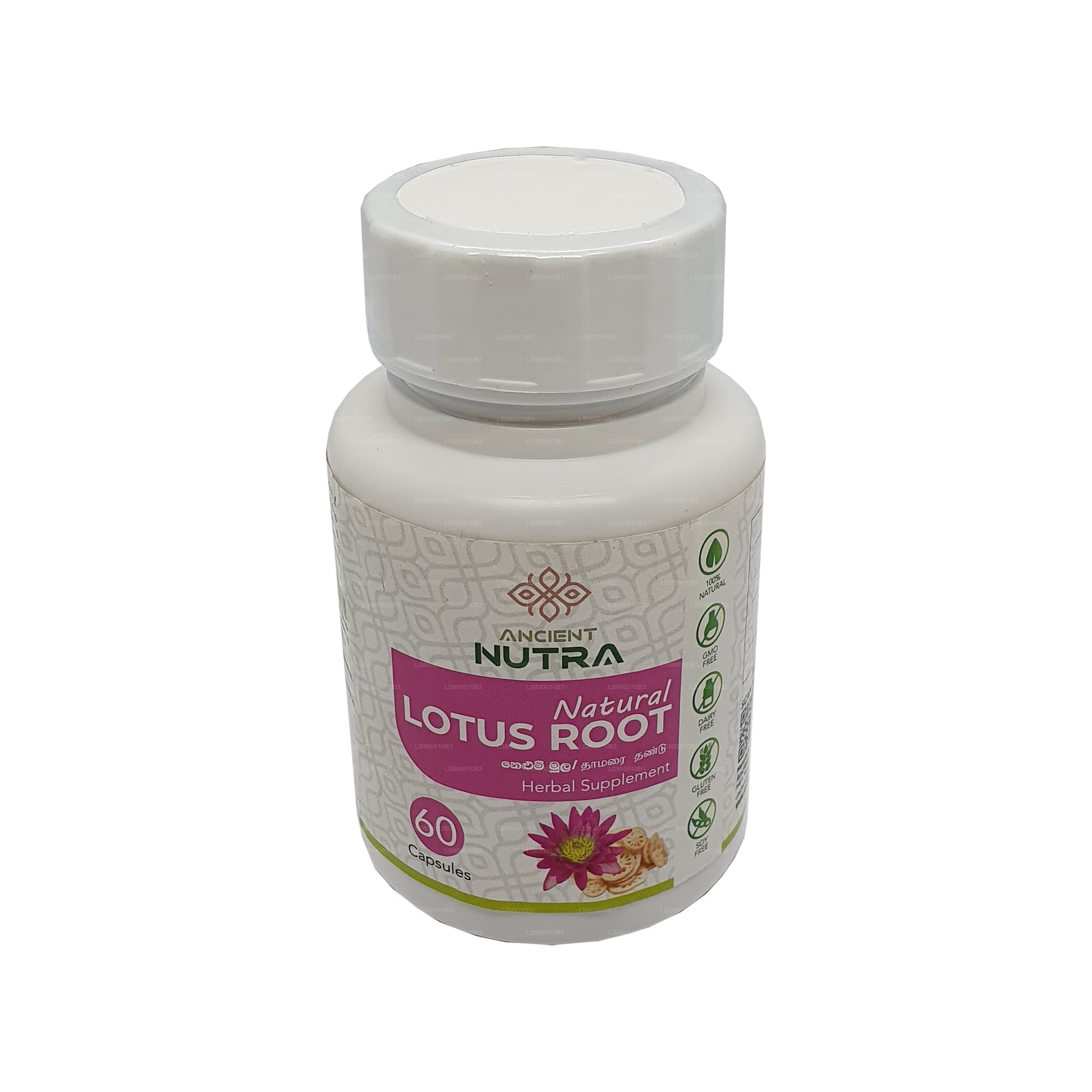 (SKU : LS800010B3) Libérez le pouvoir de la sagesse ancienne avec les capsules Ancient Nutra Lotus Root. Ces capsules contiennent de l'extrait de racine de lotus pur et de première qualité, connu pour son riche contenu nutritionnel et ses bienfaits pour la santé.Principaux avantages :Riche en antioxydants pour combattre les radicaux libresFavorise la santé digestive grâce aux fibres alimentairesFavorise la santé cardiaque en contrôlant le taux de cholestérolRenforce le système immunitaire avec des vitamines et des minéraux essentielsAméliore l'énergie et la vitalitéChaque flacon contient 60 gélules faciles à avaler, ce qui le rend pratique à intégrer dans votre routine quotidienne. Découvrez le potentiel de bien-être de la racine de lotus avec Ancient Nutra.Remarque : Consultez un professionnel de santé avant de commencer tout nouveau complément alimentaire