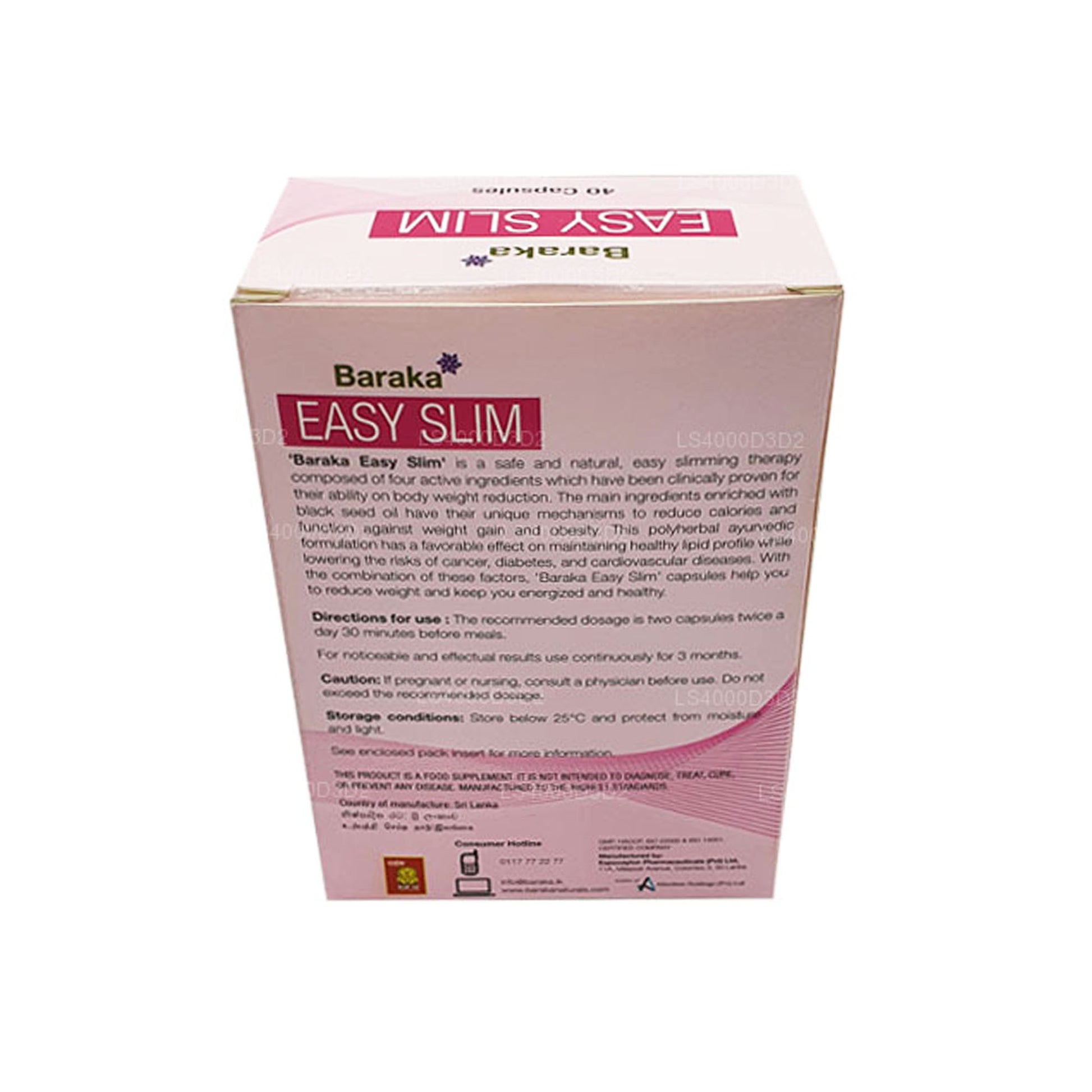 100% naturel, Baraka easy slim est une thérapie amincissante sûre qui se présente sous forme de 40 gélules. Il est composé de quatre ingrédients actifs principaux dont le potentiel de gestion et de réduction du poids a été cliniquement prouvé. Tous ces ingrédients possèdent des mécanismes uniques qui agissent contre l'obésité et la prise de poids.