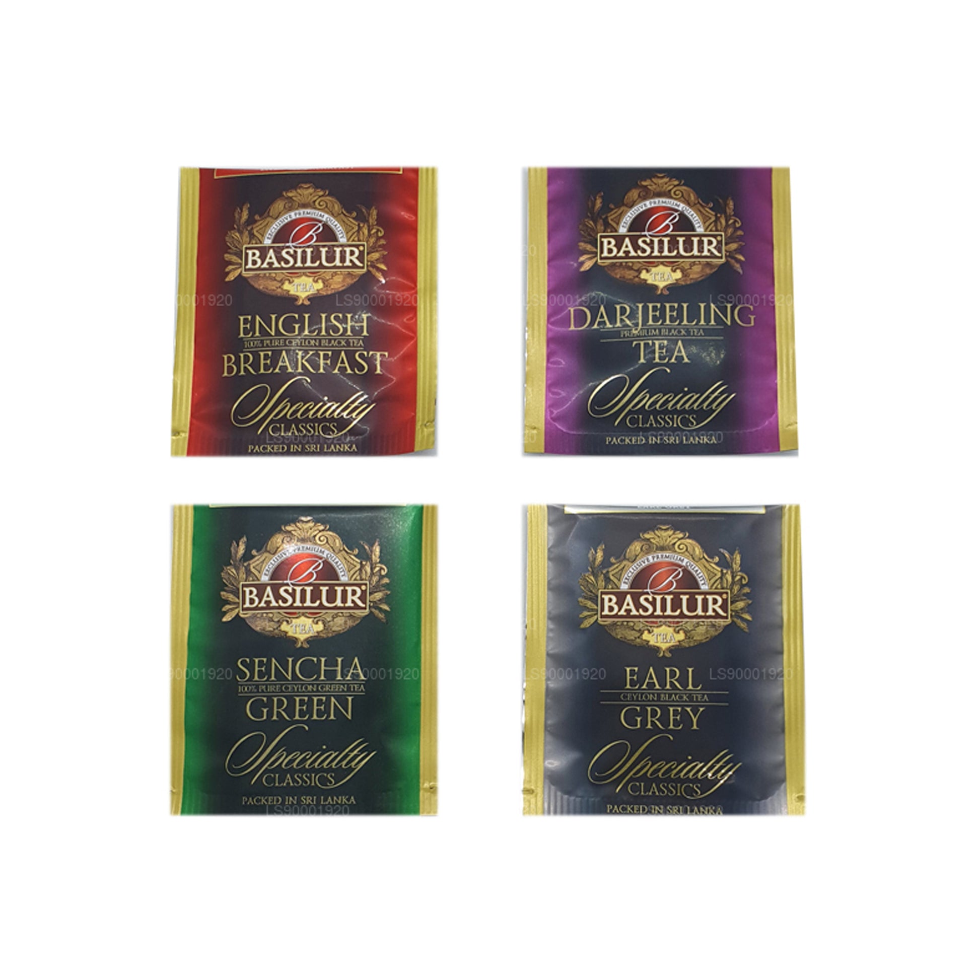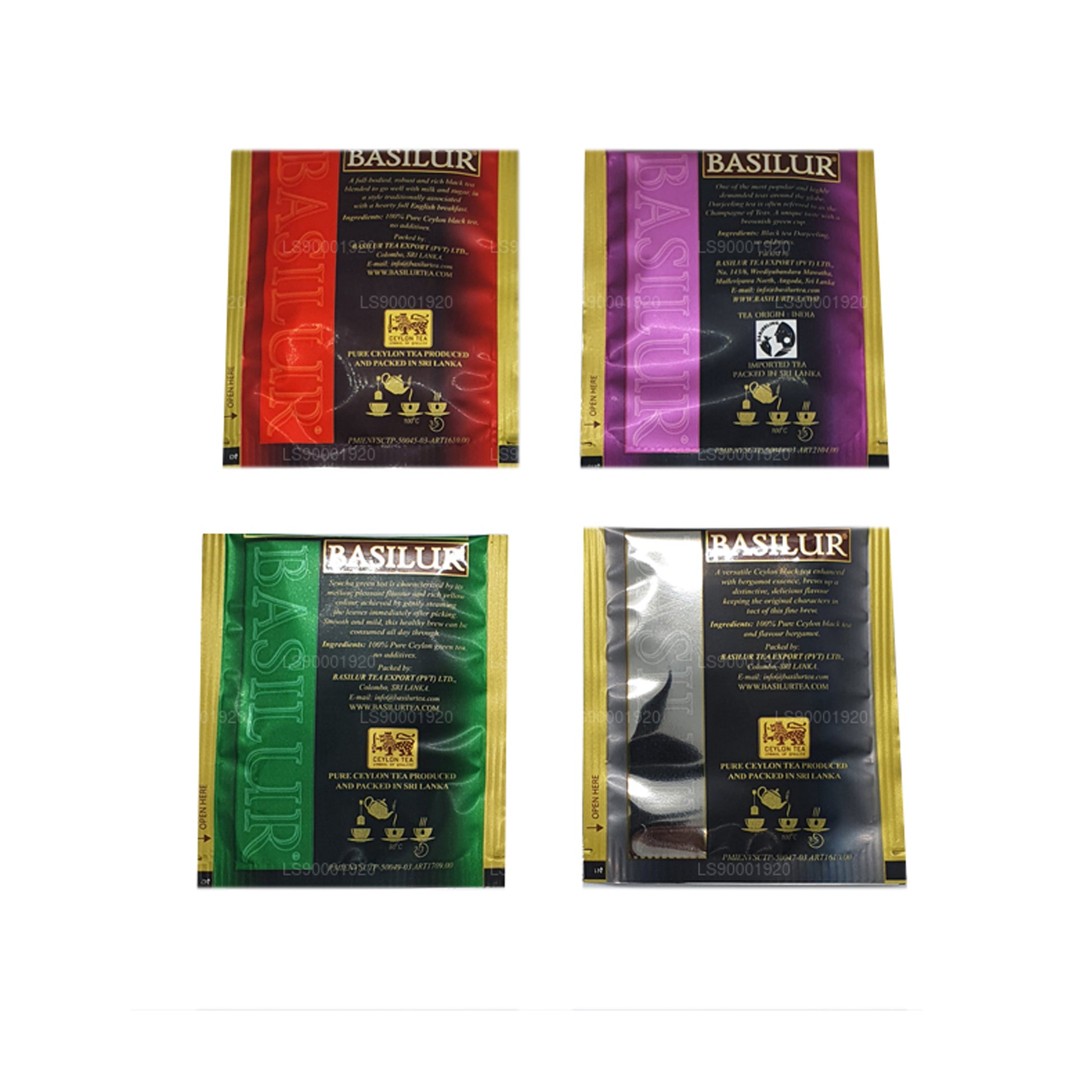 8 sachets de thé emballés dans du papier aluminium x 4 types de thé emballés dans une boîte en métal.