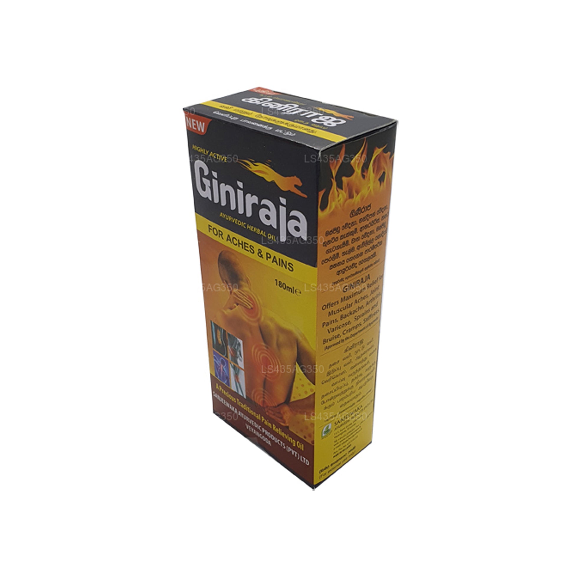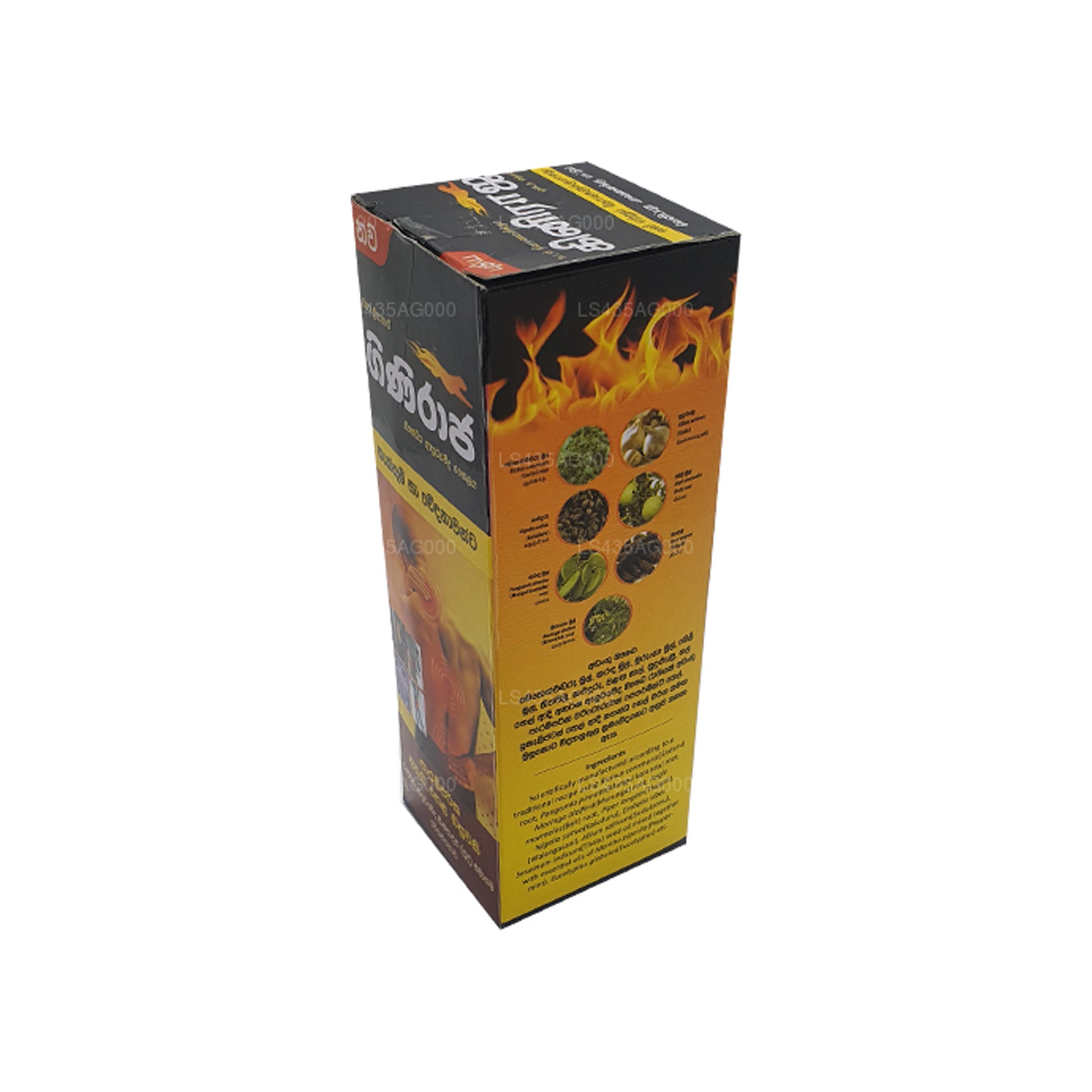 L'huile végétale analgésique Chandanalepa Giniraja a été fabriquée à partir d'un mélange d'herbes naturelles et d'extraits botaniques, notamment la racine d'Icinus communis (Endaru), la racine de Pongamia pinnata (Mangul karanda), la racine de Moringa oleifera (Murunga), la racine d'Aegle marmelos (Beli), Piper longum (Thippili), Nigella sativa (Kaluduru), Huile de graines d'Embelia ribes (Walangasaal), d'Allium sativum (ail), de Sesamum indicum (Thala, sésame) mélangée à des huiles essentielles de Mentha piperita (menthe poivrée), d'Eucalyptus globulus (Eucalyptus), etc. Veuillez noter que cette huile est destinée à un usage externe à utiliser uniquement et lors de l'utilisation, vous devez suivre les instructions fournies avec la boîte.