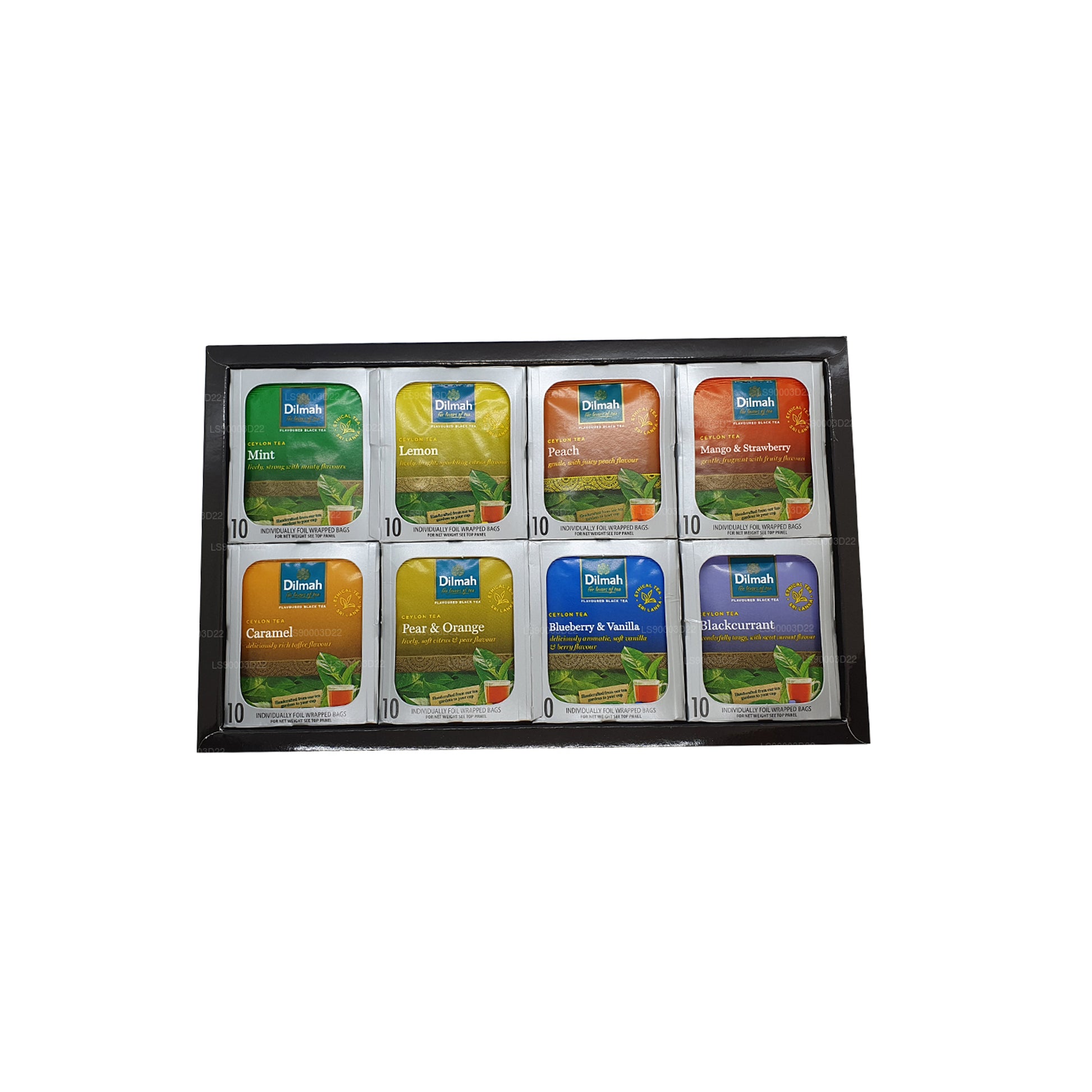 (SKU : LS90003D22) Des thés qui ne manqueront pas d'animer, de rafraîchir et d'exciter. Pris chauds ou glacés, ce sont des thés vraiment amusants. Thé de Ceylan délicat et moyennement corsé avec une touche de saveur. Caramel, pêche, menthe, citron, myrtille et vanille, cassis, poire et orange, mangue et fraise. Dix sachets de thé emballés individuellement, chacun de huit parfums. Un thé avec une touche d'originalité ! L'introduction parfaite à une alternative passionnante au thé normal. Les thés Dilmah Fun sont excellents à prendre chauds ou glacés. Peut-être même avec une pincée de votre alcool préféré. Aromatique et délicieusement plein de saveurs.