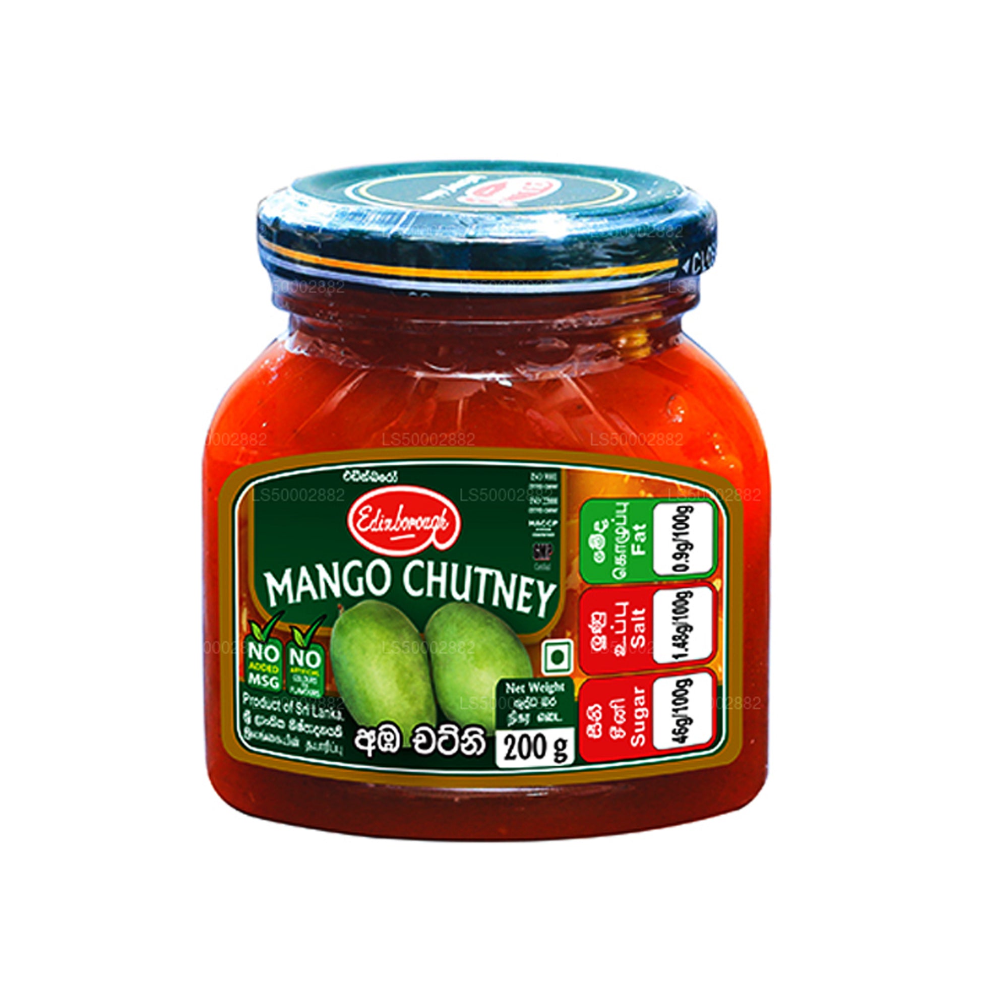Ingrédients : morceaux de mangue, sucre, eau, sel de table lodisé, poudre de piment, gomme xanthane, acide acétique (INS 260), gingembre, ail, poudre de girofle, épices et agent de conservation alimentaire autorisé (INS 211).