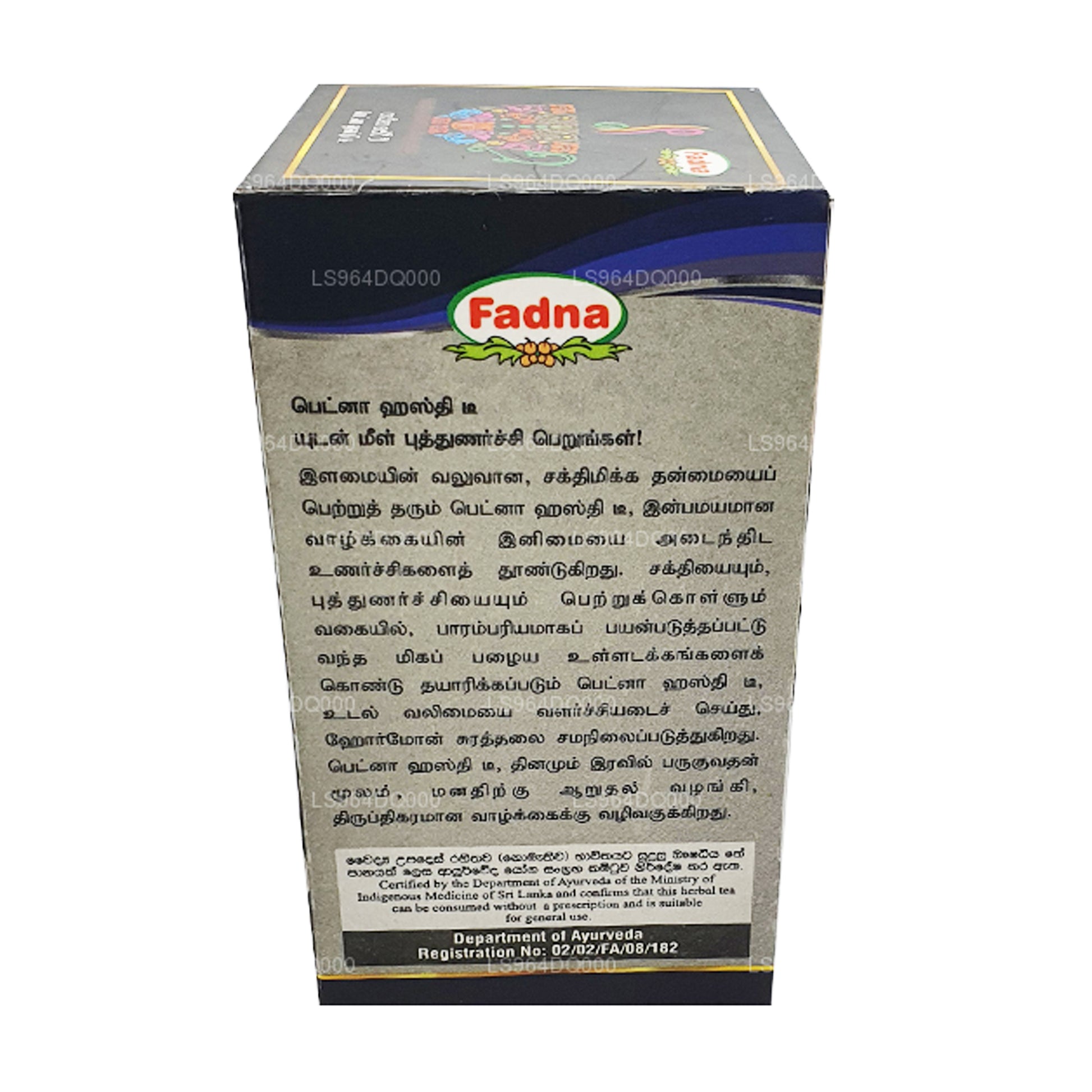 .Ingrédients : thé noir/thé vert (Camellia sinensis), Withania somnifera (Ashwagandha), Cardiospermum halicacabum (Welpenela), Vitis vinifera (vigne), Osbeckia octandra (Heen-bovitiya), Tinospora cordifolia (Rasakinda), Nigella sativa (Kaluduru), vitamines A, B7, C et E, minéraux : zinc, fer,