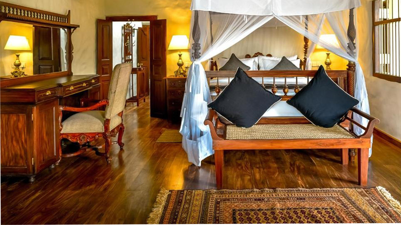 The Walawwa features spacious rooms with colonial-style décor, combining modern comfort with traditional Sri Lankan charm. Each room includes comfortable bedding, private bathrooms, air conditioning, and large windows offering views of the surrounding gardens or nearby beach.