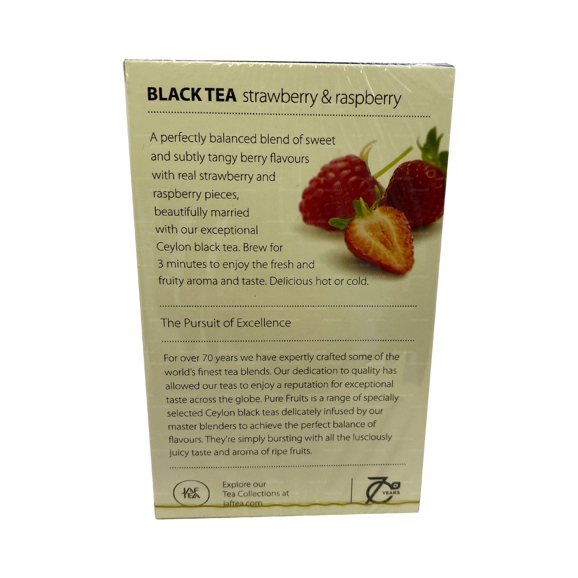 (SKU : LS9010A1A3) Un mélange parfaitement équilibré de saveurs de baies sucrées et subtilement acidulées avec de véritables morceaux de fraise et de framboise, magnifiquement associé à notre exceptionnel thé noir de Ceylan. Laissez infuser pendant 3 minutes pour profiter de l'arôme et du goût frais et fruités. Délicieux chaud ou froid.