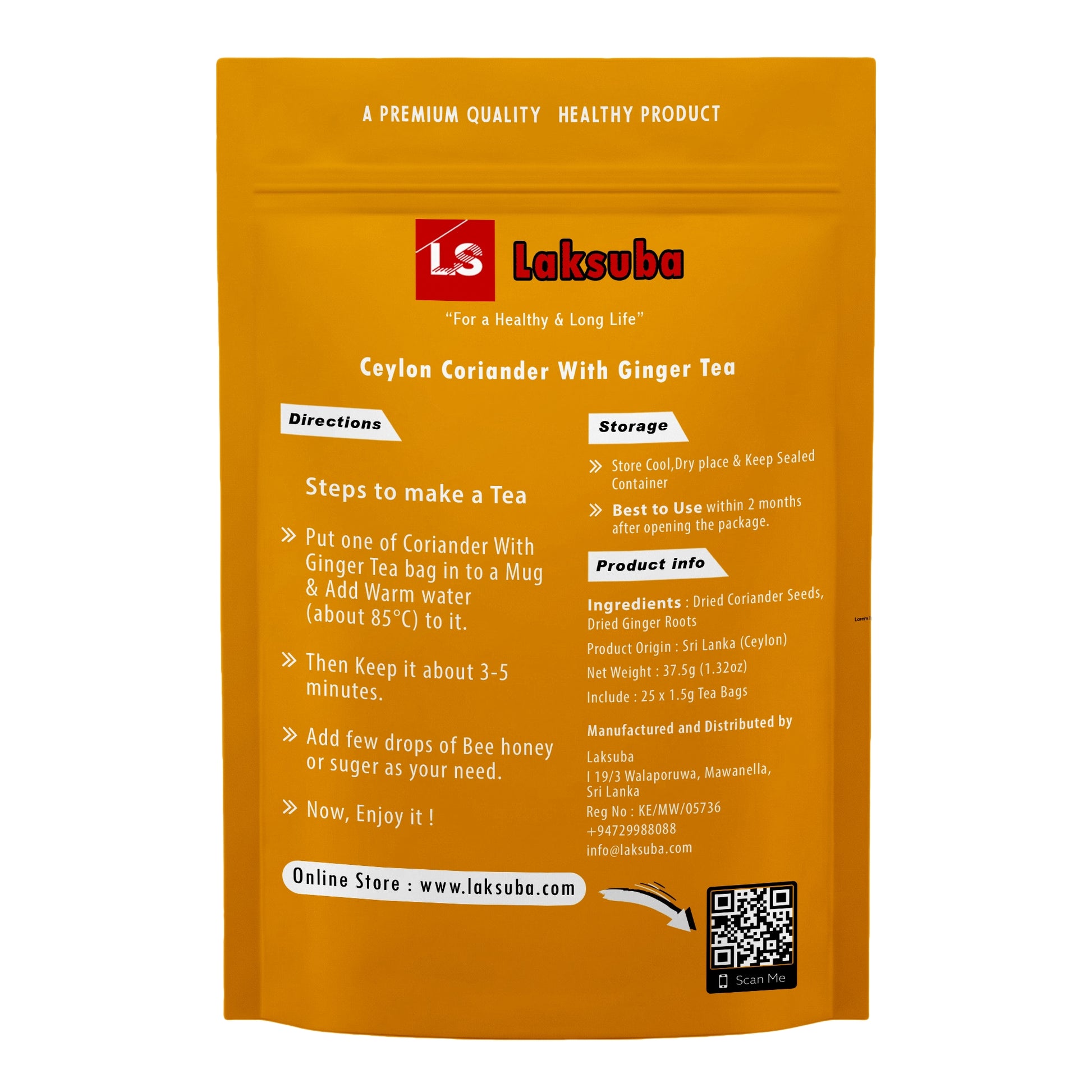 Laksuba Le Thé de Coriandre avec Gingembre de Ceylan est un mélange d'herbes soigneusement élaboré qui combine les bienfaits naturels des graines de coriandre déshydratées et des racines de gingembre, emballé dans 25 sachets de thé pratiques pour offrir une expérience de boisson rafraîchissante et aromatique. Chaque sachet de thé contient un mélange équilibré de Coriandrum sativum et Zingiber officinale, créant un profil de saveur réchauffant et vivifiant qui éveille les sens et offre une boisson herbacée apaisante sans produits chimiques ajoutés ni caféine. Provenant du Sri Lanka et fabriqué avec uniquement des ingrédients naturels, ce thé est conditionné dans un sachet ziplock écologique et refermable, garantissant fraîcheur et commodité à chaque utilisation. Pour le savourer, il suffit de plonger un sachet de thé dans de l'eau chaude pendant 3 à 5 minutes et d'améliorer le goût avec quelques gouttes de miel ou de votre édulcorant préféré. Parfait pour les rituels de bien-être quotidiens ou les moments de relaxation, cette infusion de coriandre et de gingembre reflète l'art traditionnel du thé aux herbes tout en offrant une tasse délicieuse de chaleur et de confort.