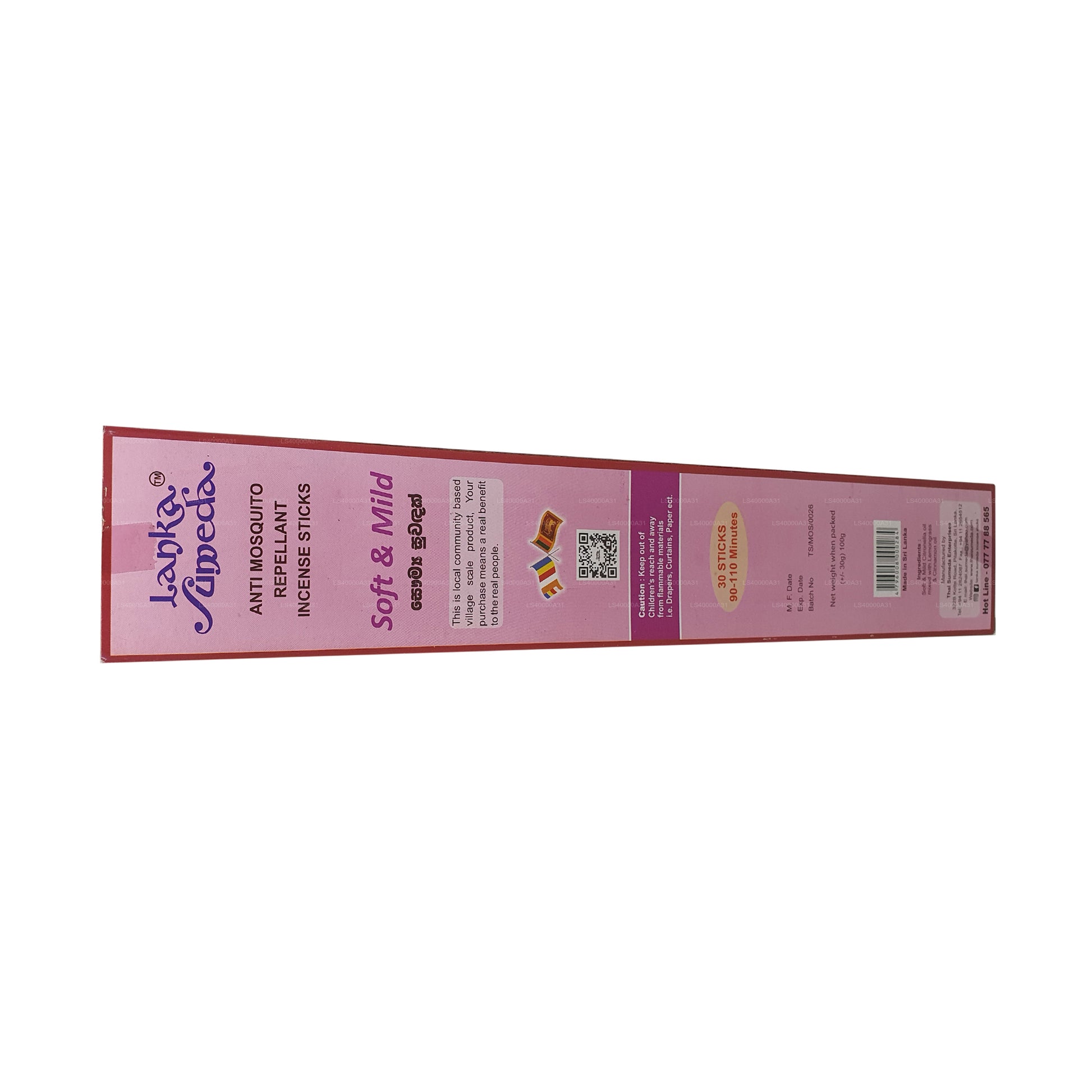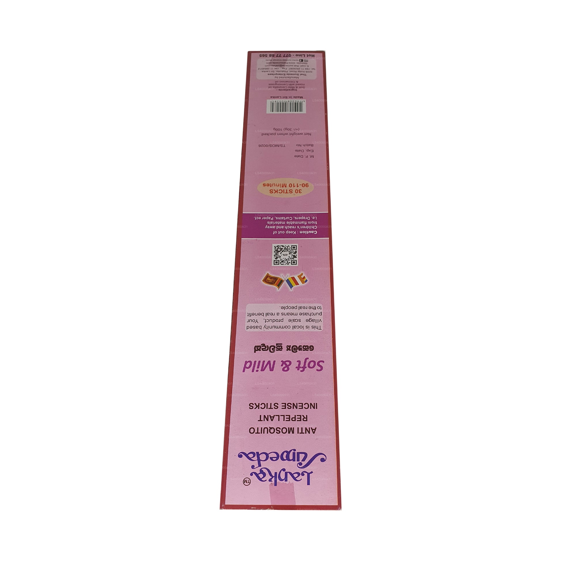 All Lanka Sumeda products including the Anti mosquito Incense Sticks are certified as 100% lead free and non-toxic making it perfectly safe to use in your household or work place, where ever you feel like there is an influx of mosquitos. All products have garnered recognition as an Ozone friendly product. The Lanka Sumeda anti mosquito incense sticks are pleasantly fragrant and mild while they burn for about 1 ½ - 2 hours. Enjoy lasting protection from mosquitos indoors and outdoors anytime of the day.