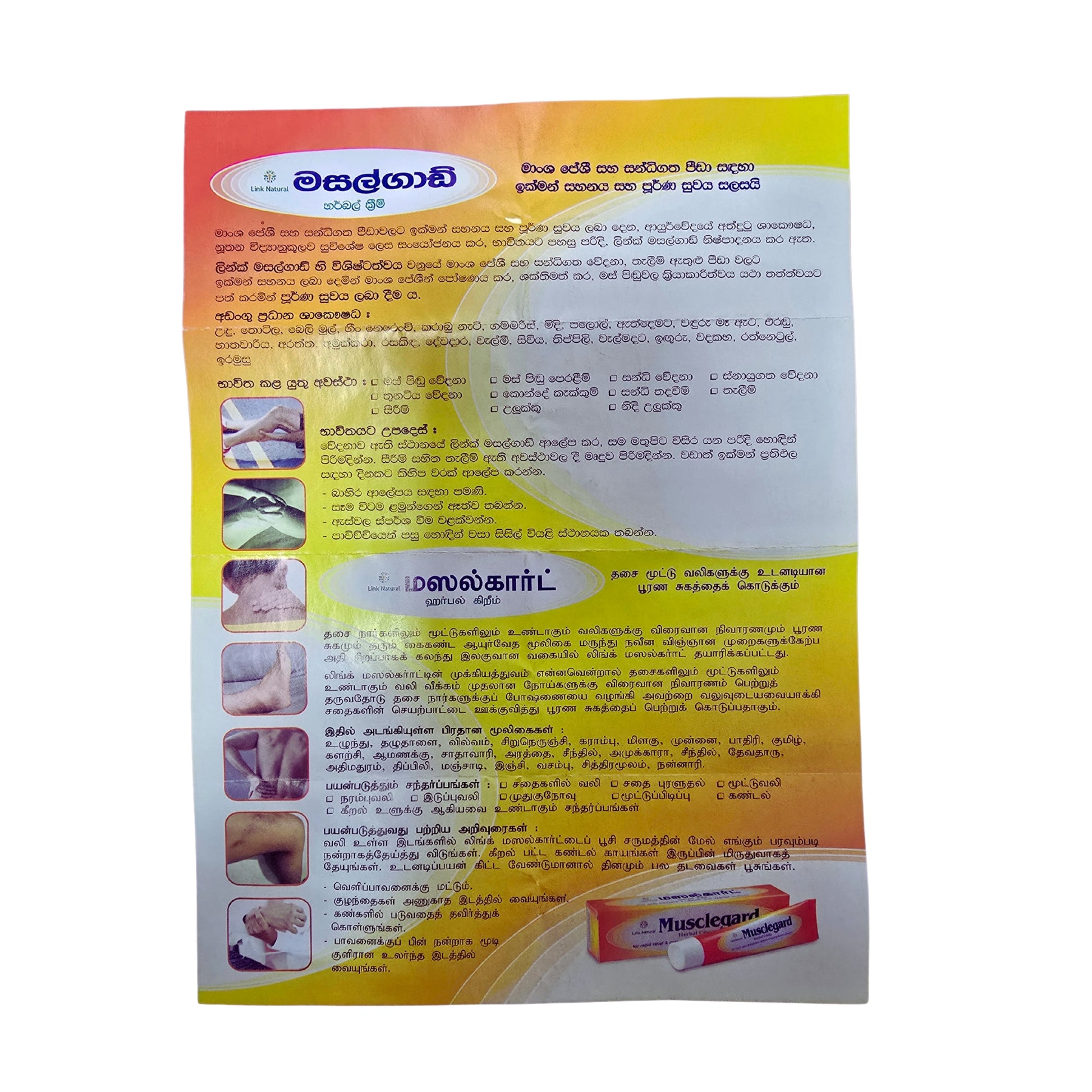 Link Musclegard Herbal Cream assure un soulagement rapide et une guérison complète des troubles musculaires, entorses, lumbago, éraflures, raideur de la nuque, douleurs lombaires, crampes musculaires, raideur des articulations, contusions, et douleurs articulaires et névralgiques.