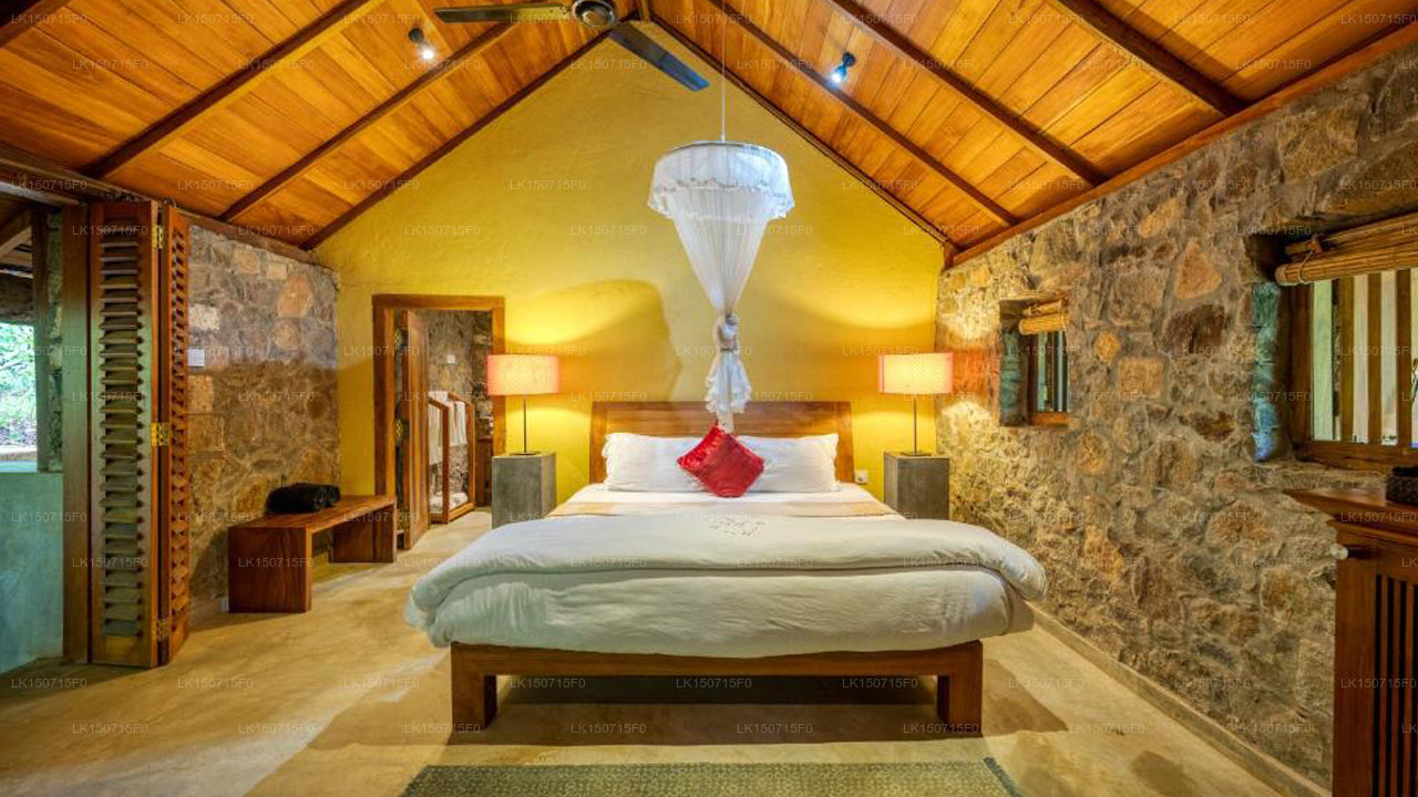 The resort features nine uniquely designed suites that blend traditional Sri Lankan architecture with modern comforts. Options include luxury villa suites with private courtyards and plunge pools, as well as forest pavilions constructed from local timber, offering semi-open walls for an immersive nature experience. All rooms are furnished with antiques and provide views of the surrounding forest or paddy fields.
