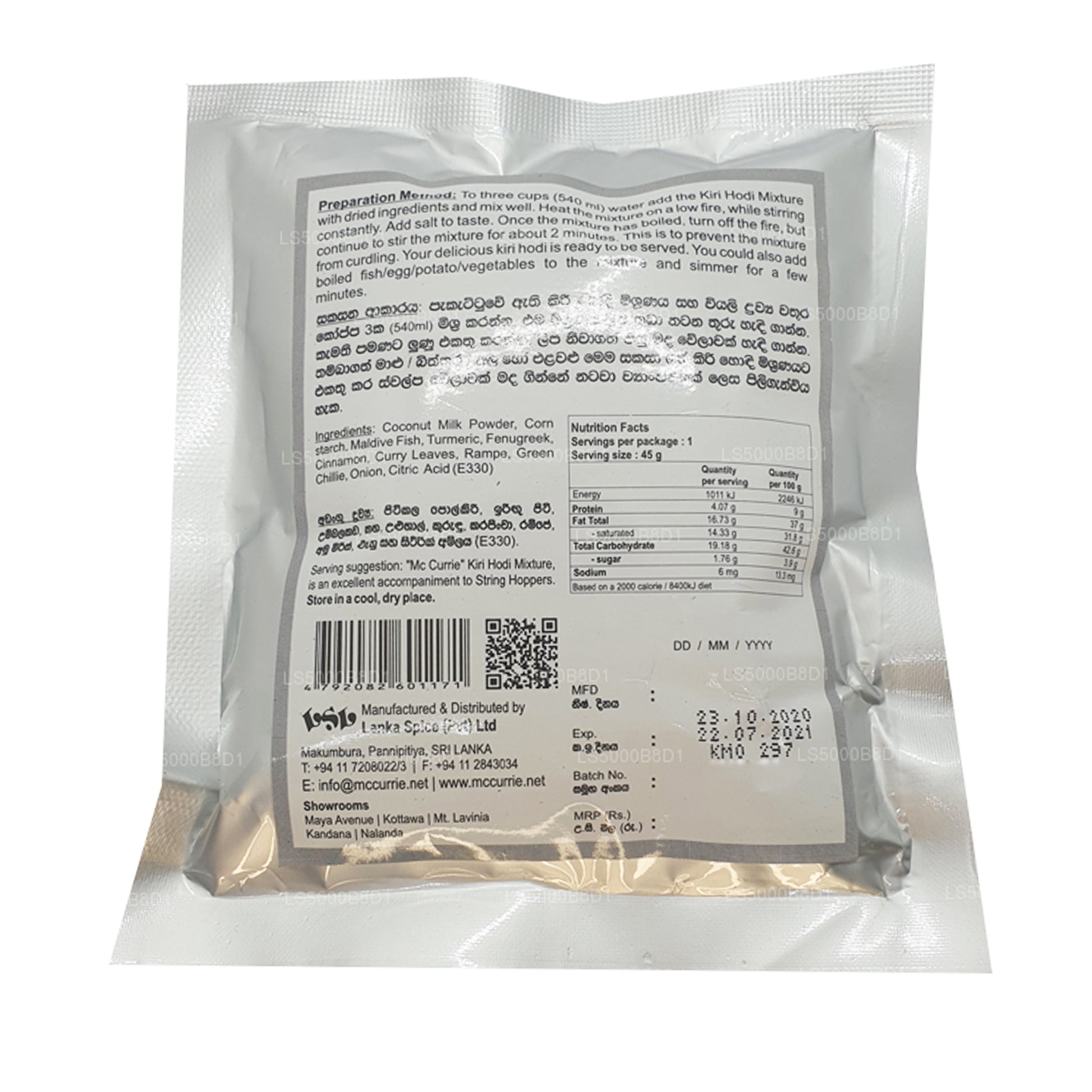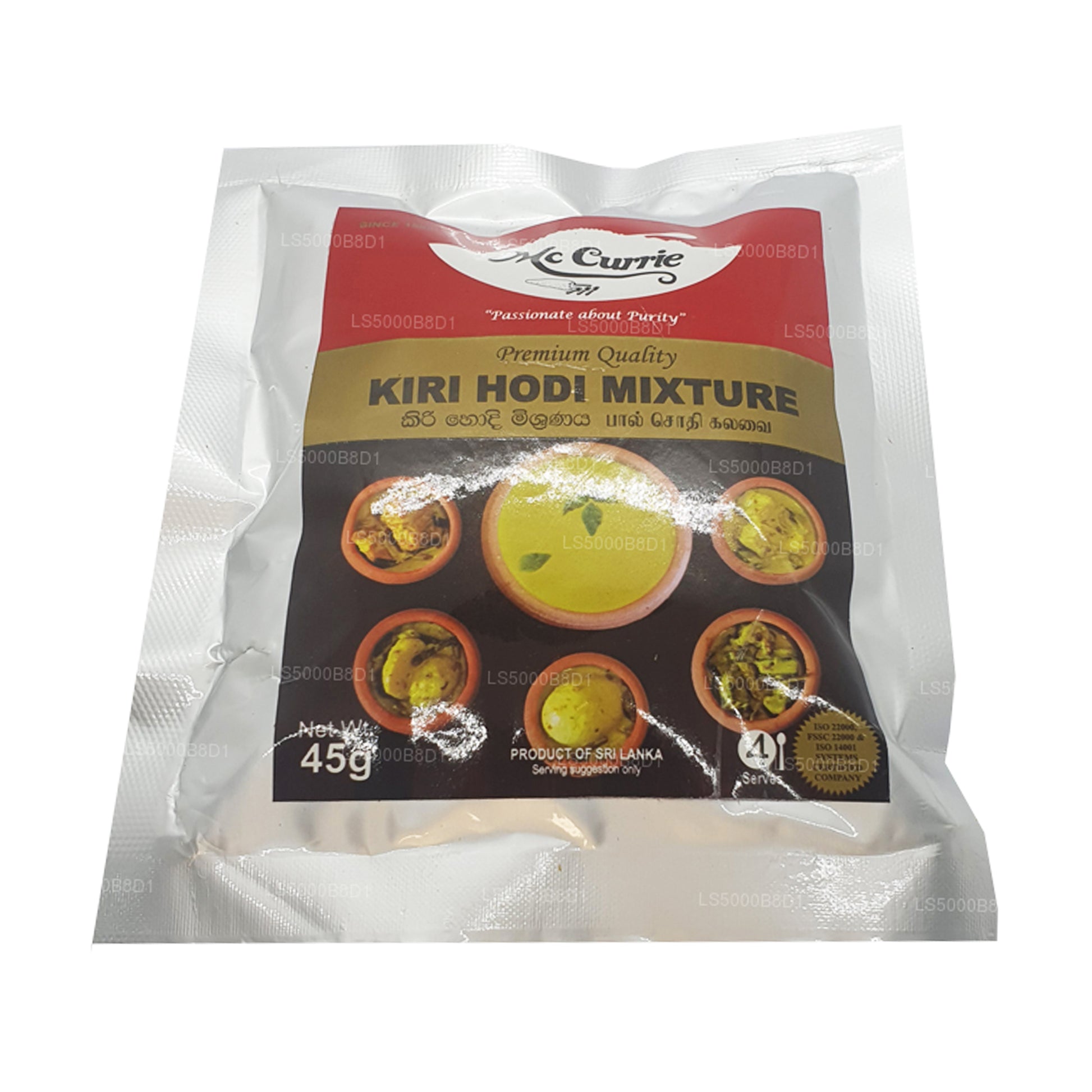 (SKU : LS5000B8D1) Le Kiri Hodi est une sauce au lait de coco populaire et traditionnelle du Sri Lanka. Préparé à partir de quelques ingrédients de base, ce plat est traditionnellement servi chaud avec du sambol à la noix de coco (pol sambola) ou des trémies (idiyappam). Des légumes et du poisson peuvent être ajoutés à la sauce pour obtenir un plat de curry plus copieux.