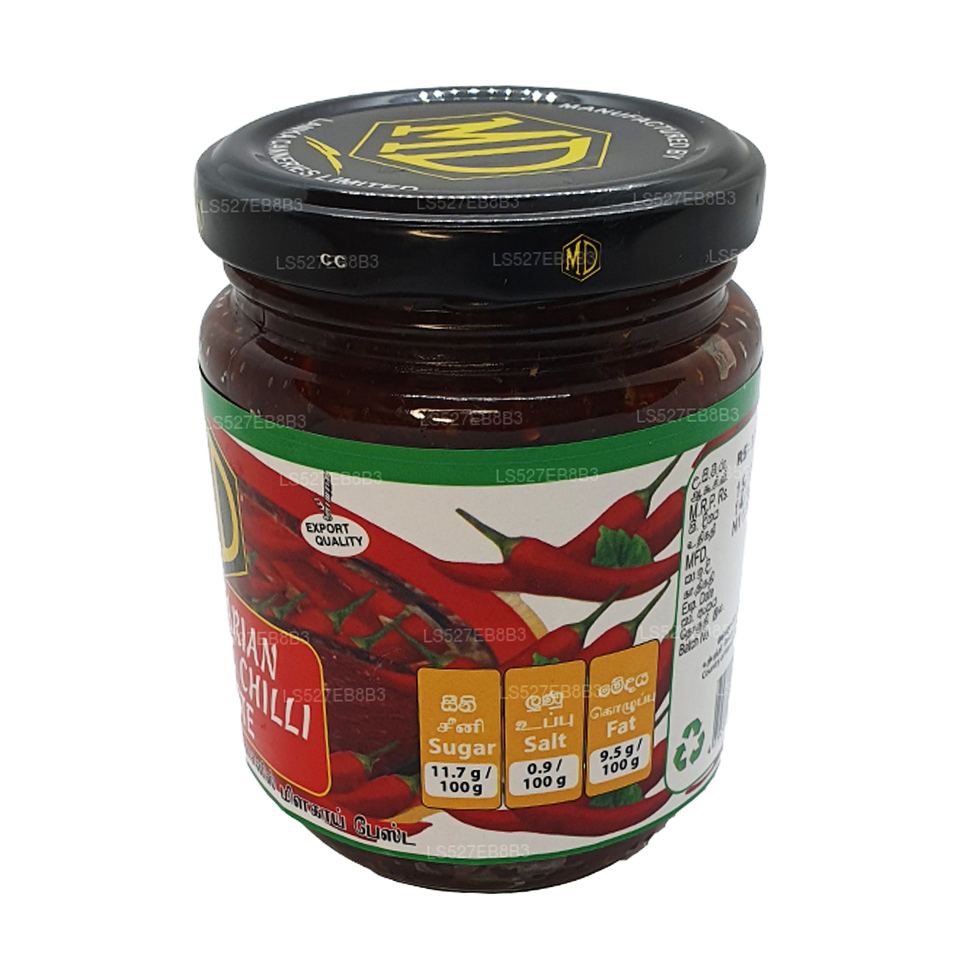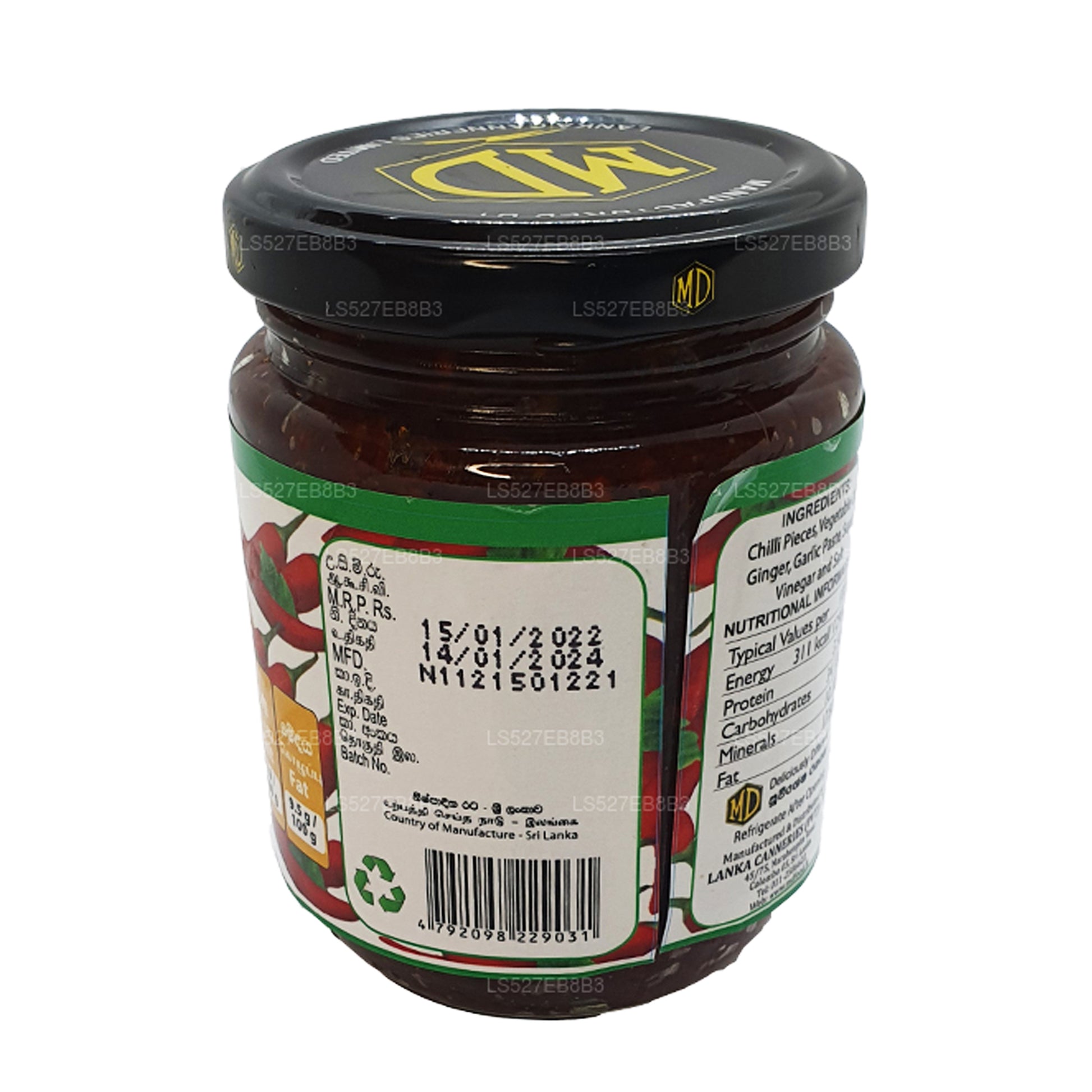 (SKU : LS527EB8B3) Tous les produits MD ont été fabriqués selon des contrôles de qualité stricts. La sélection des fruits et légumes fait l'objet d'une inspection minutieuse, ce qui garantit que le procédé de fabrication des pâtes à tartiner MD extrait le plus possible de fruits et légumes purs. Les produits MD sont les produits préférés des Sri Lankais depuis des générations et font partie de leur alimentation quotidienne.Ingrédients :Morceaux de piment, huile végétale, gingembre, pâte d'ail, sucre, vinaigre et sel