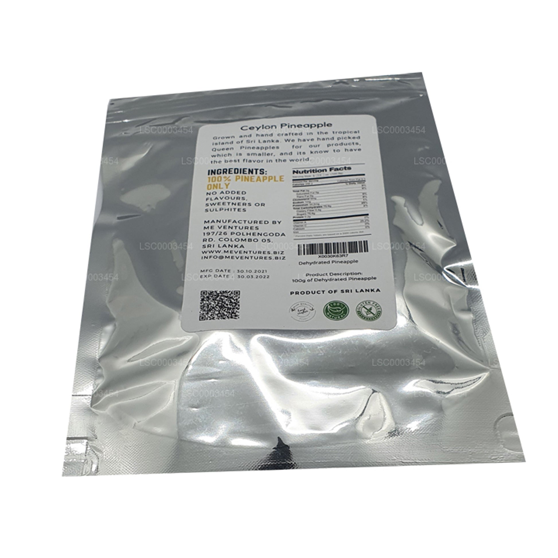 (SKU : LSC0003454) L'ananas déshydraté ME (100 g) est une collation de haute qualité à base d'ananas mûrs. Il est sucré et acidulé, sans additifs artificiels. Ce sac portable et refermable est parfait pour les collations sur le pouce. Riche en nutriments essentiels tels que des vitamines et des fibres, c'est une friandise saine et polyvalente, végétalienne et sans gluten. Savourez le goût des tropiques à chaque bouchée avec cet incontournable du garde-manger