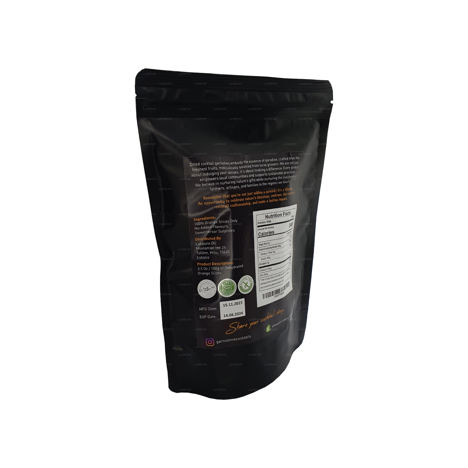 sophisticated touch to elevate your mixology experience. Carefully crafted from premium oranges and dehydrated to perfection, these vibrant slices offer a burst of citrusy flavor and a visually appealing aesthetic to your cocktails. Each 100g pack is a harmonious blend of convenience and freshness, ensuring that the essence of sun-kissed oranges is readily available for your mixological creations. Whether adorning your favorite cocktails, mocktails, or even desserts, Me Garnish Dehydrated Orange Slices add a zesty twist that tantalizes the senses. Unleash your creativity behind the bar and let the versatility of these cocktail garnishes transform your libations into masterpieces. Embrace the Me Garnish experience – where sophistication meets simplicity in every slice. Cheers to flavor, style, and the art of cocktail perfection.